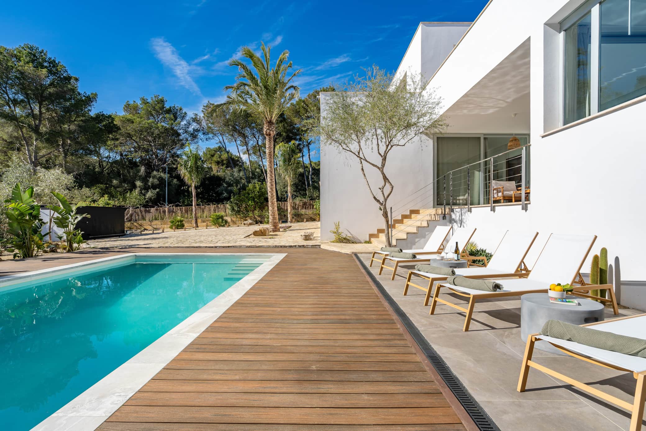 Eine erstklassig ausgestattete Küche, der Essbereich und das Wohnzimmer laden zu gemeinsamen Mahlzeiten und entspannten Abenden ein. Der überdachte Lounge- und Essbereich bietet einen Blick auf den Salzwasserpool und in den grünen, gepflegten Garten. Dort lässt es sich auf dem Daybed besonders gut unter den Palmen entspannen.Â